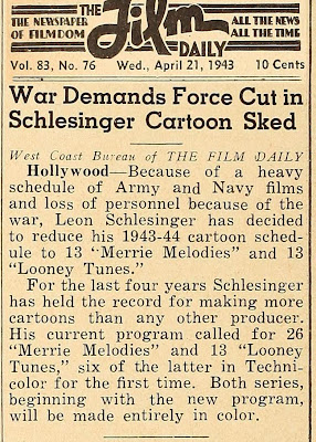 By April 1943, Leon Schlesinger realized he could no longer keep up the pace. The producer who’d delivered 39 cartoons annually for the previous four seasons was looking at a staff sharply reduced by war service coupled with an obligation to provide “Private SNAFU” cartoons for the Signal Corps, plus his own declining health, and decided to cut his theatrical output by a third. However, his distributor, Warner Bros., wanted to keep 39 reels in the annual pipeline. Thus was born the BLUE RIBBON HIT PARADE.
